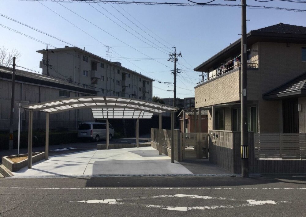 どちらの通りからでも出入りできる使いやすい駐車スペースになり、開放感のあるエクステリアになりました。