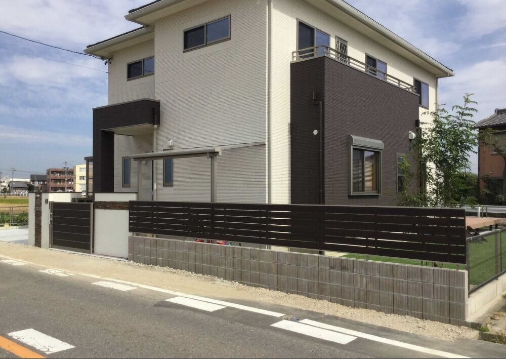 建物の色と合わせたブラウンのスライド門扉は、スマートな収まりで、間口広々。